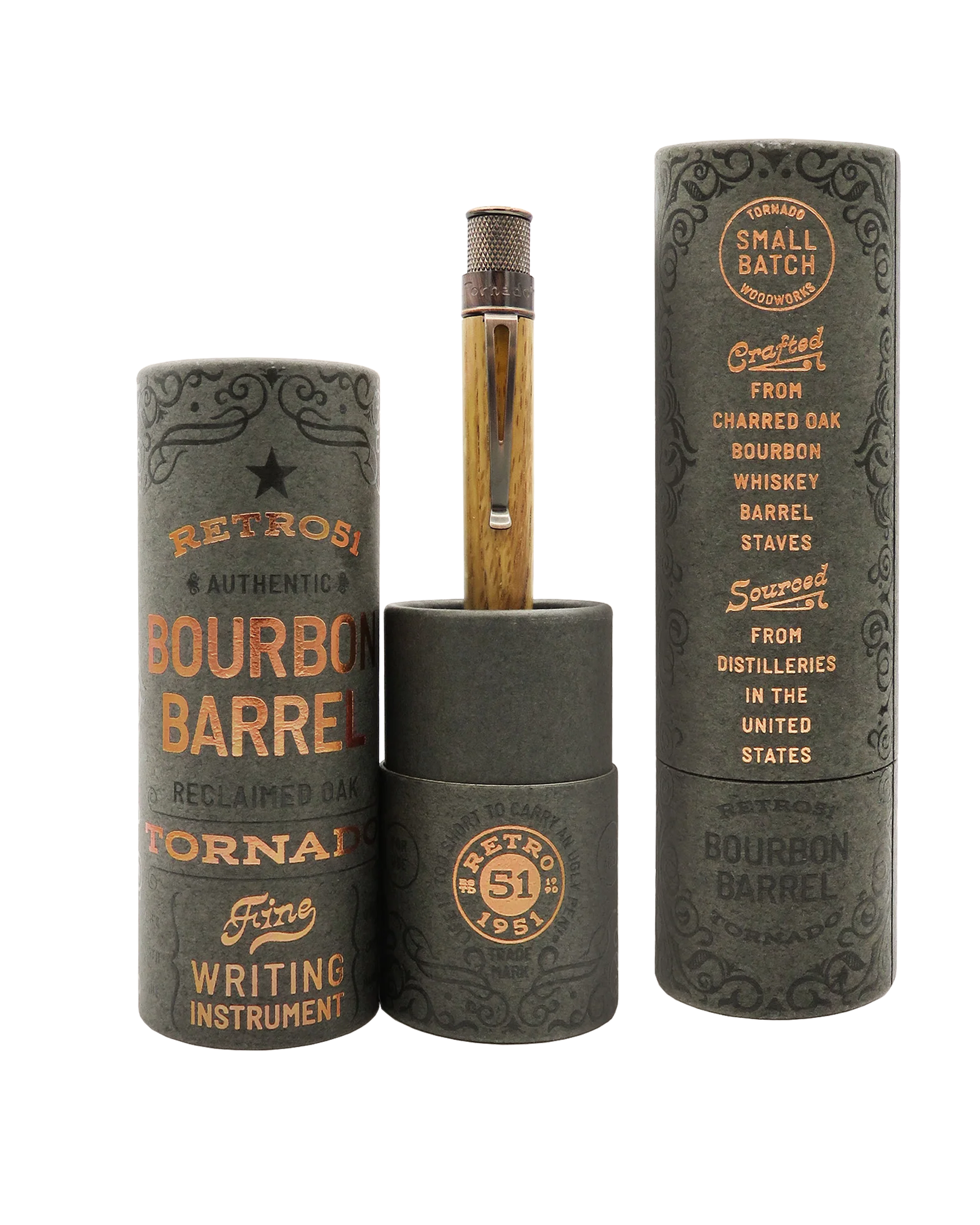 Steeped in tradition and quality craftsmanship, these pens have been meticulously produced from charred oak barrel staves that once housed some of the finest bourbon whiskey in the United States.